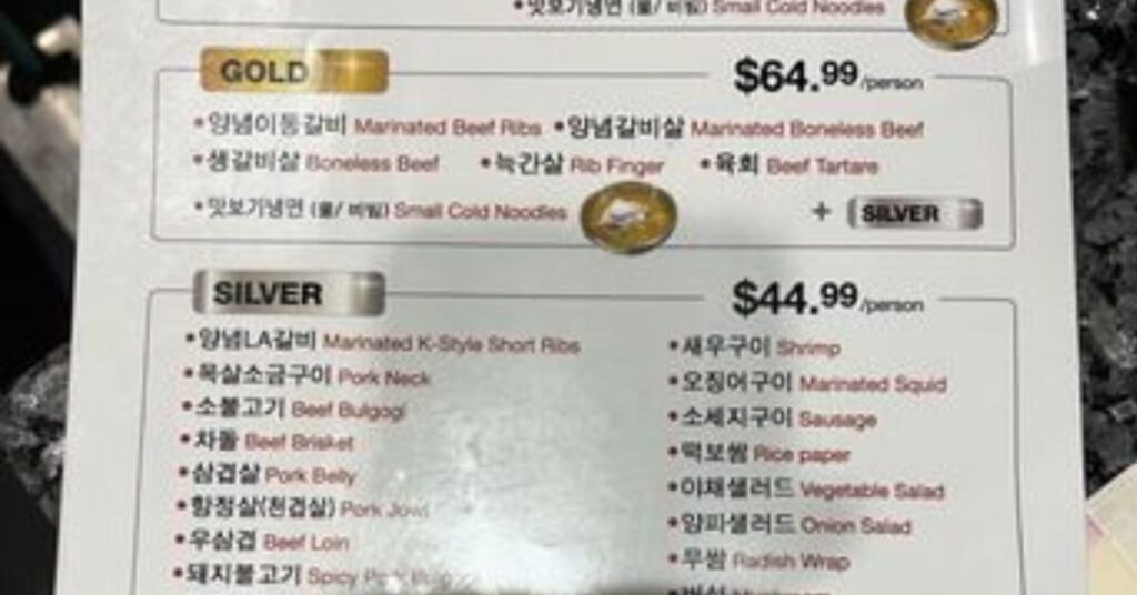 Item Note Price Marinated Beef Ribs 양념이동갈비 Marinated Beef Ribs Rib Finger 늑간살 Rib Finger Beef Tartare 육회 Beef Tartare Boneless Beef 생갈비살 Boneless Beef Marinated Boneless Beef 양념갈비살 Marinated Boneless Beef Small Cold Noodles 맛보기냉면 (물/비빔) Small Cold Noodles Silver Menu Included + SILVER