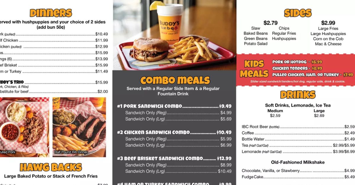 The Buddy’s BBQ Menu tells the story of a Tennessee favorite that’s been firing up smokers since 1972. Founded by Buddy Smothers in Knoxville, Buddy’s BBQ began as a small roadside joint with one mission — to serve real pit-smoked barbecue made from scratch every day. In the long run, its reputation for tender pulled pork, slow-smoked ribs, and that unmistakable smoky aroma spread across East Tennessee, leading to multiple locations and a loyal fan base.