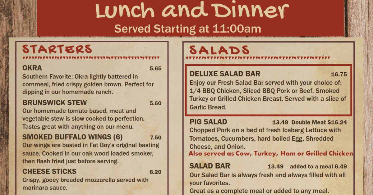 Fat Boys BBQ Menu began as a small roadside smoke shack decades ago, founded by a local pitmaster who believed slow-cooked meat and Southern hospitality could bring a community together. From its first location in Central Florida, Fat Boys BBQ grew steadily as travelers, families, and BBQ lovers spread the word. What started as a humble neighborhood joint quickly became a regional favorite, and the menu evolved right alongside its popularity.