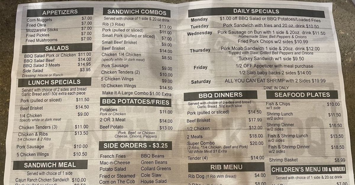 As the restaurant grew, so did the Fred Cotten’s Landmark BBQ Menu, evolving from simple smoked meats to hearty plates, combo specials, and signature sides that regulars still crave today.