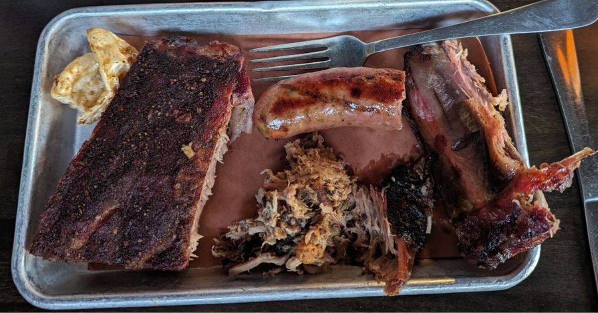 Item Note Price Pulled Pork Platter Two Sides | King’s Hawaiian Roll | House Pickles | Pickled Onions $17.50 Chopped Brisket Platter Two Sides | King’s Hawaiian Roll | House Pickles | Pickled Onions $20.95 Smoked Turkey Platter Two Sides | King’s Hawaiian Roll | House Pickles | Pickled Onions $17.25 Jalapeno Cheddar Sausage Platter Two Sides | King’s Hawaiian Roll | House Pickles | Pickled Onions $16.00 1/4 Chicken Platter Two Sides | King’s Hawaiian Roll | House Pickles | Pickled Onions $13.25 1/2 Chicken Platter Two Sides | King’s Hawaiian Roll | House Pickles | Pickled Onions $18.95 Half Rack Platter Two Sides | King’s Hawaiian Roll | House Pickles | Pickled Onions $22.50 Half Fried Rack Platter Two Sides | King’s Hawaiian Roll | House Pickles | Pickled Onions $22.75 Full Fried Rack Platter Two Sides | King’s Hawaiian Roll | House Pickles | Pickled Onions $33.95 2 Meat Combo Two Sides | King’s Hawaiian Roll | House Pickles | Pickled Onions $22.75 3 Meat Combo Two Sides | King’s Hawaiian Roll | House Pickles | Pickled Onions $25.75 Side Plate 4 Sides | Grilled Bread | House Pickles $14.50